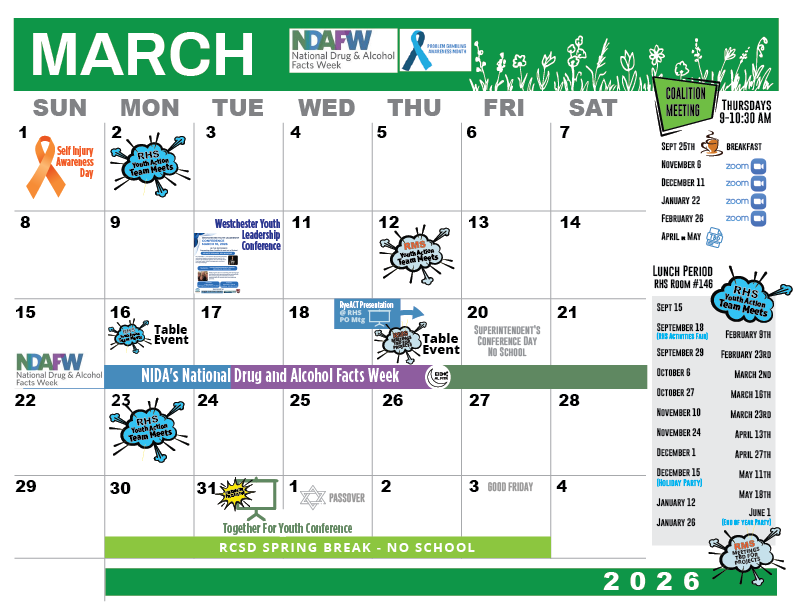 We contract with The Iona College Center for Social Research (Director, Jeanne Matich-Maroney, PhD, LCSW-R) to provide survey data analysis and evaluation services. We also contract with the Montana State University Center for Health & Safety Culture (Senior Research Scientist, Katherine Dively, M.S., MCHES) to consult on ongoing strategy development. Both of these valuable thought partners work with Coalition leadership to provide recommendations to the RyeACT Steering Committee.